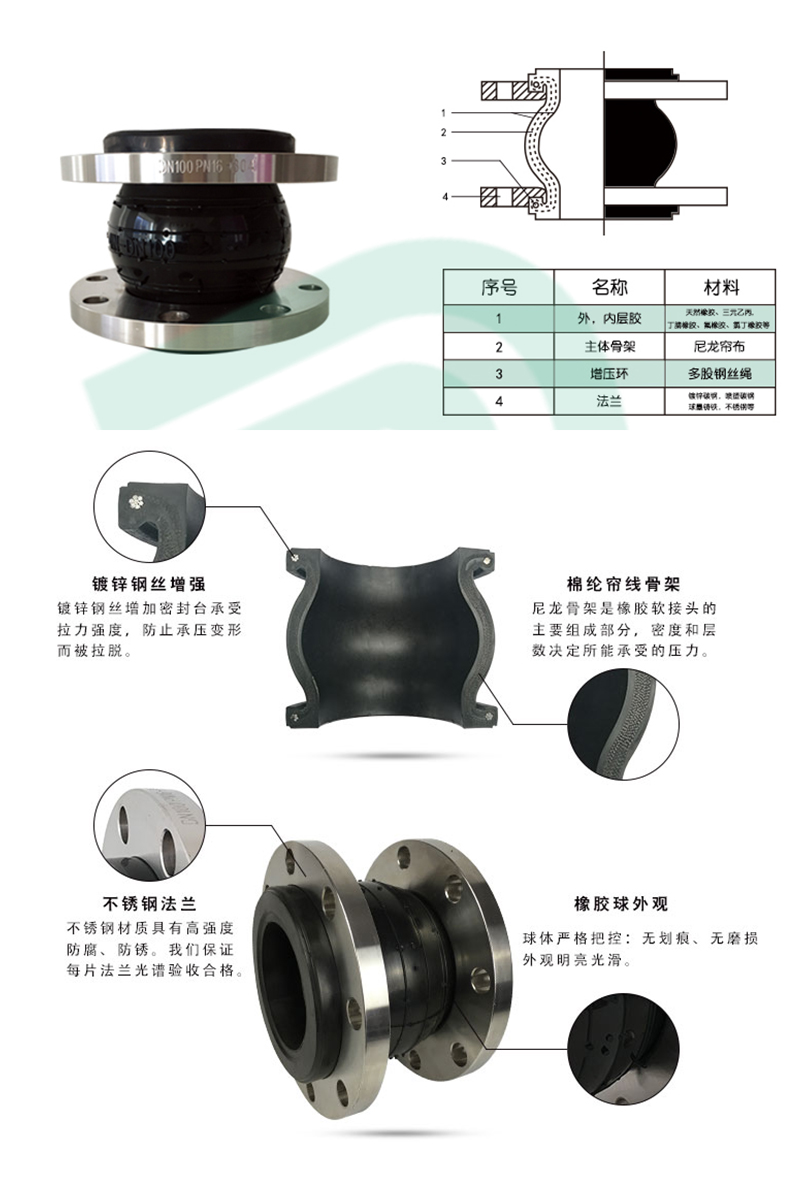 橡膠軟接頭一般由內膠層、織(zhī)物增強層(céng)(簾子布)、中膠層、外膠層、端部加固金屬環或鋼絲圈,經高溫(wēn)、高壓硫化成型後,與金屬法蘭或平行接頭鬆套組合而成的複合橡膠(jiāo)管其(qí)使用壽命取決於簾子布(bù)的質量。